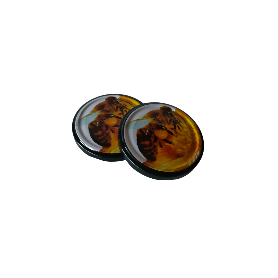 Os frascos são compatíveis com tampa TO 66, disponível em cinco opções: dourada, preta, branca, decoração temática de abelha ou de favos. (sujeito a disponibilidade).