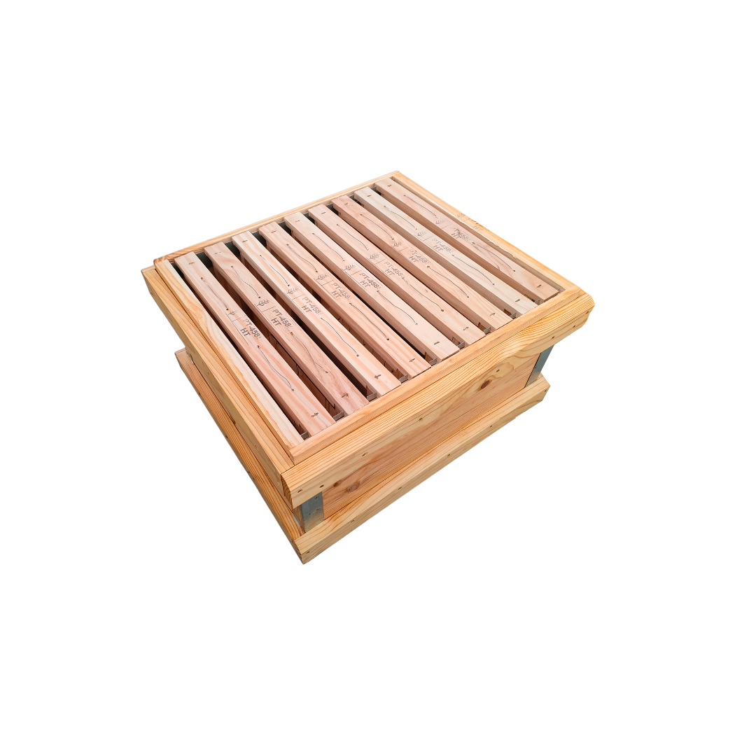 Inclui 9 quadros não tensionados sem cera, permitindo ao apicultor preparar a alça de acordo com as suas preferências e o tipo de colónia. O design robusto garante estabilidade, ventilação e fácil integração na colmeia.