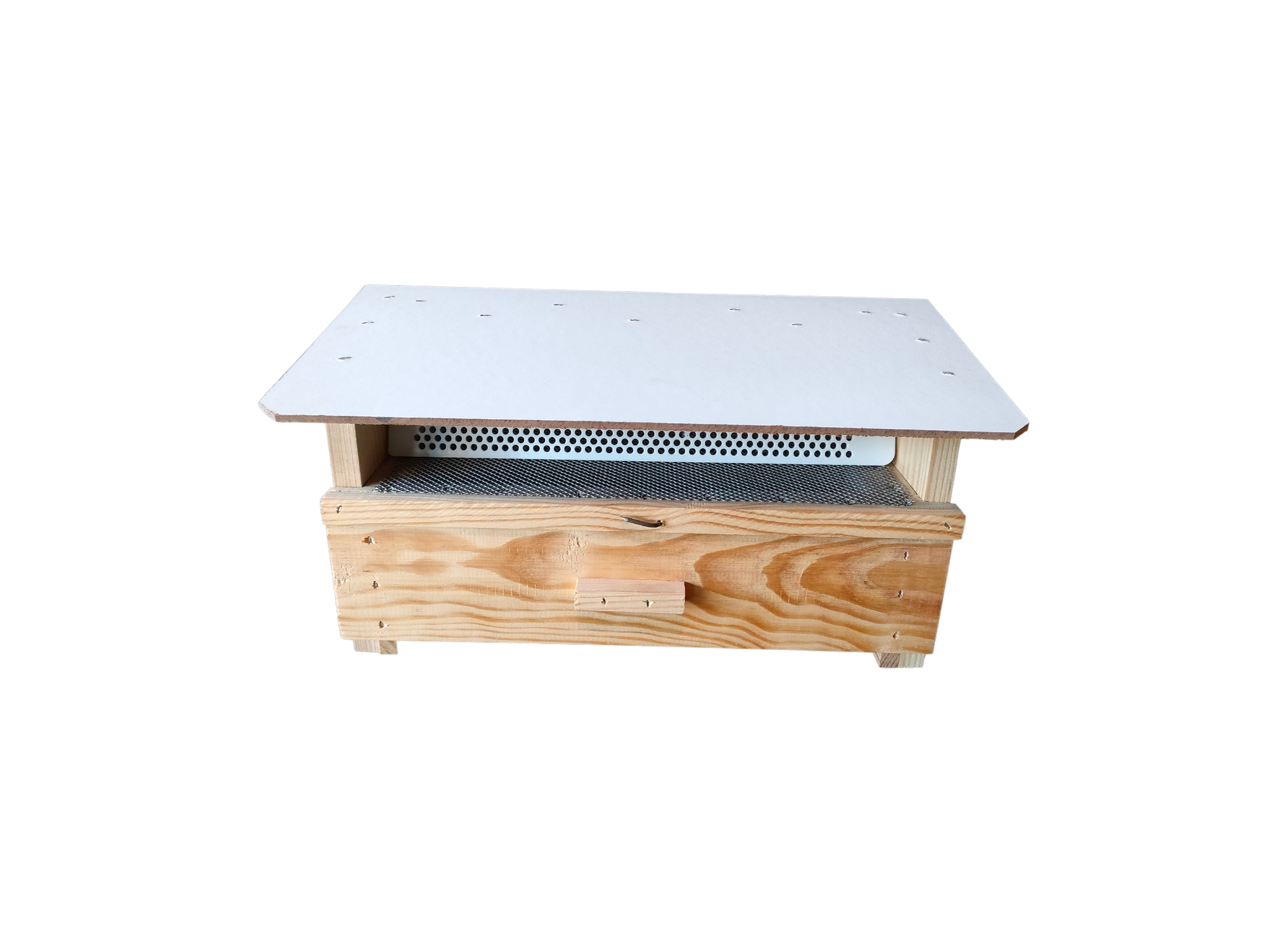A sua grelha central obriga as abelhas a passar por pequenos orifícios ao entrarem na colmeia, fazendo com que os grãos de pólen caiam suavemente na caixa de recolha.