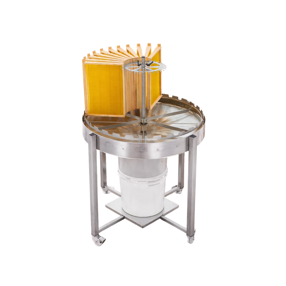 • Funcionalidade e ergonomia: o seu design permite que o mel escorrido seja recolhido num tanque central, facilitando o procedimento posterior e tornando o processo mais cómodo e higiénico. Dispõe de um pente superior deslizante, ajustável a qualquer tipo de quadro, fixado por duas alças que asseguram um encaixe preciso e rápido. Além disso, o carrossel contém rodas sólidas com travões, facilitando a sua deslocação e garantindo estabilidade em todas as superfícies. É possível colocar um balde sob o carrossel, o que facilita a recolha do mel que escorre, evitando desperdícios.