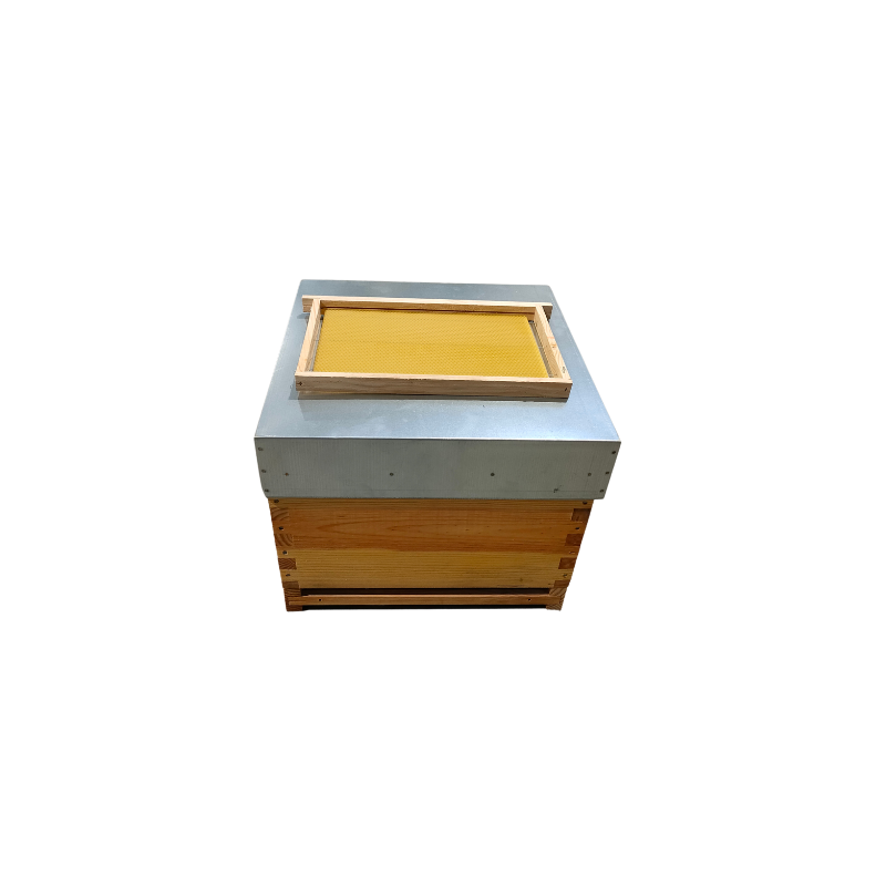 Inclui quadros com cera já montada, permitindo uma rápida instalação e facilitando o desenvolvimento inicial da colónia. Disponível com três acabamentos — cru, óleo de linhaça e parafina — para melhor adaptação às condições climáticas.