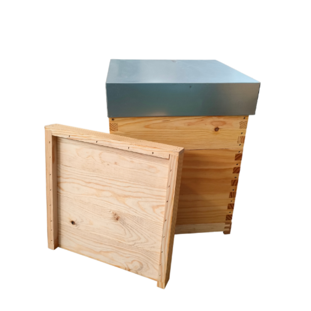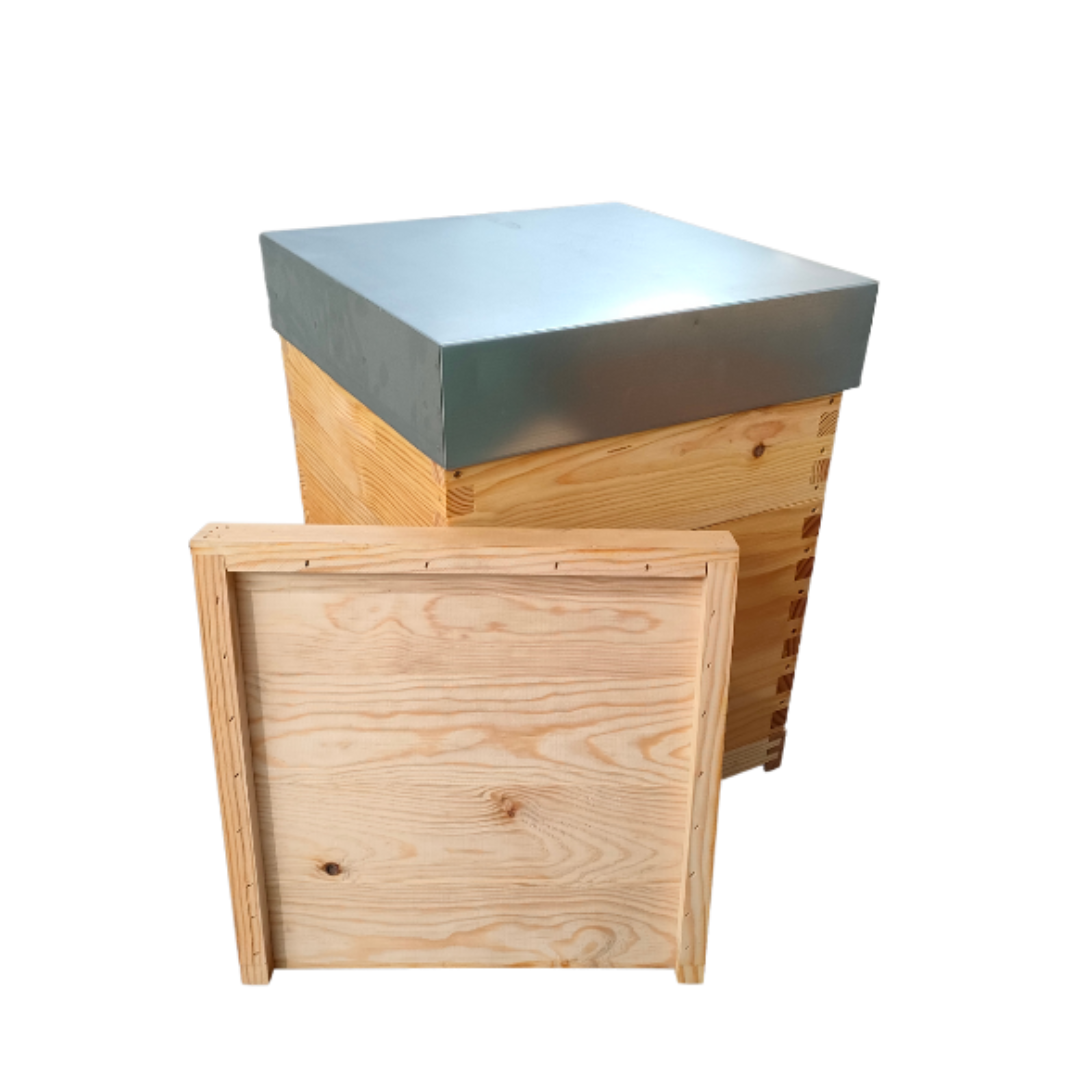 Construída em madeira com encaixe em malhete, oferece excelente estabilidade e isolamento térmico, favorecendo o bem-estar e o desenvolvimento da colónia.